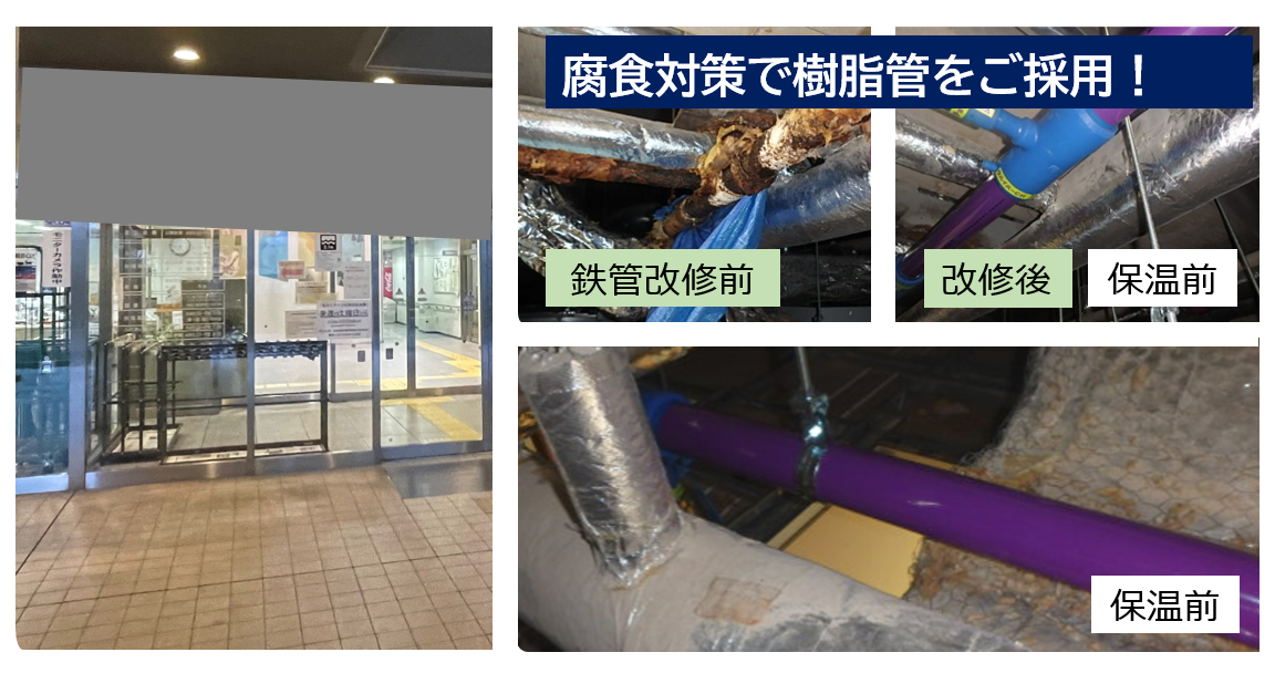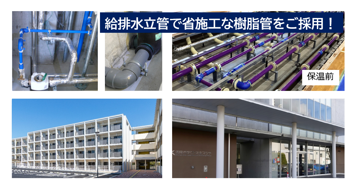 市営住宅の給排水の立管や体育館の空調冷温水配管など公共施設の改修工事で、軽量で省施工な樹脂管をご採用いただいた事例です。配管選定にあたっては豊富な採用実績が求められました。