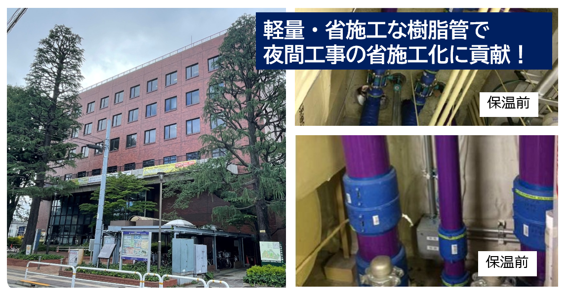 事務所ビルの空調冷温水配管改修工事で、軽量・省施工な樹脂管をご採用いただいた事例です。居ながらの夜間の改修工事であったため、重機が不要で取り回しの良さが求められました。