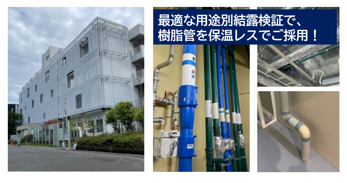 国立大学内の新築工事において、結露検証により共有部の給排水配管をいずれも保温レスで対応された事例です。配管選定時には、最適な用途別の結露検証実績が求められました。