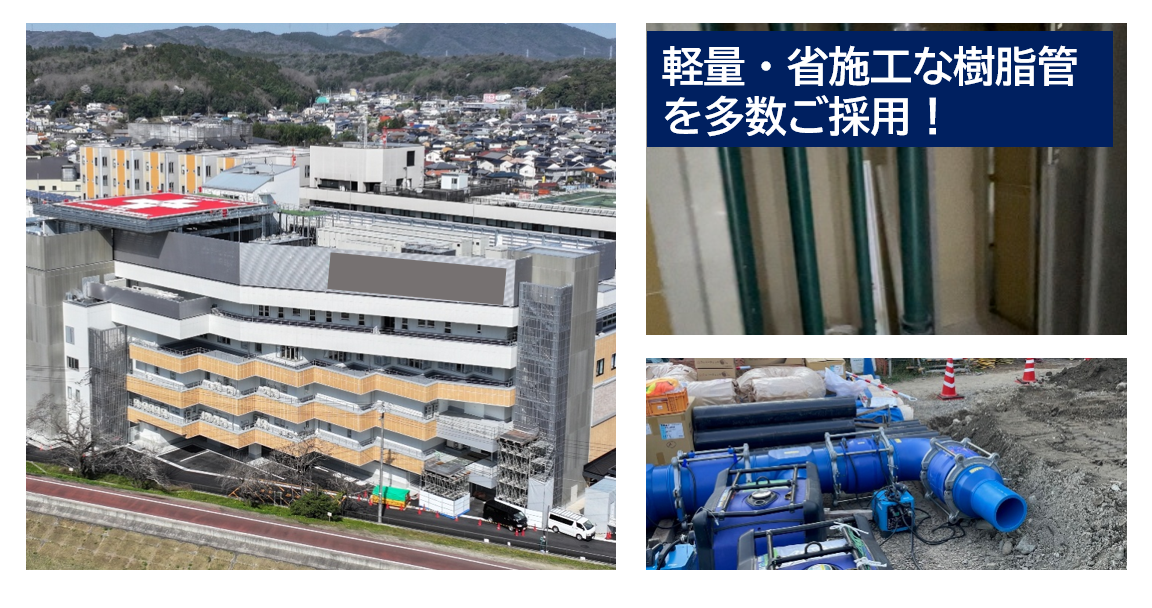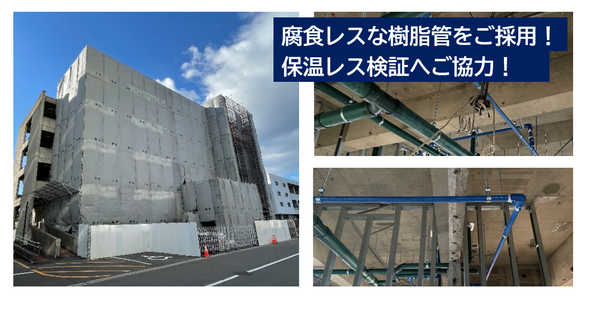 大規模病院の給排水配管の新築工事で、軽量で省施工な樹脂管をご採用いただいた事例です。配管選定にあたっては採用実績が求められました。
