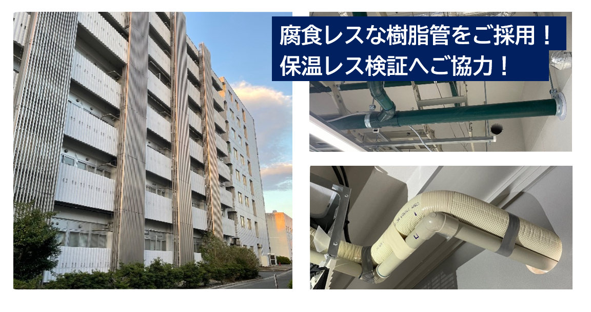 国立大学における排水管・空調配管の改修工事で、軽量で省施工な樹脂管を保温レスでご採用いただいた事例です。配管選定にあたっては他の大学様も含めた多くの採用実績が求められました。