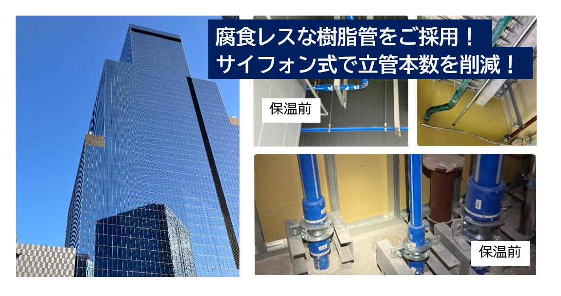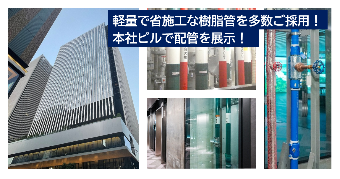 超高層の自社本社ビルにおける給排水・空調配管工事にて軽量で省施工な樹脂管をご採用いただいた事例です。配管選定にあたっては維持管理のし易さと長寿命化が求められました。