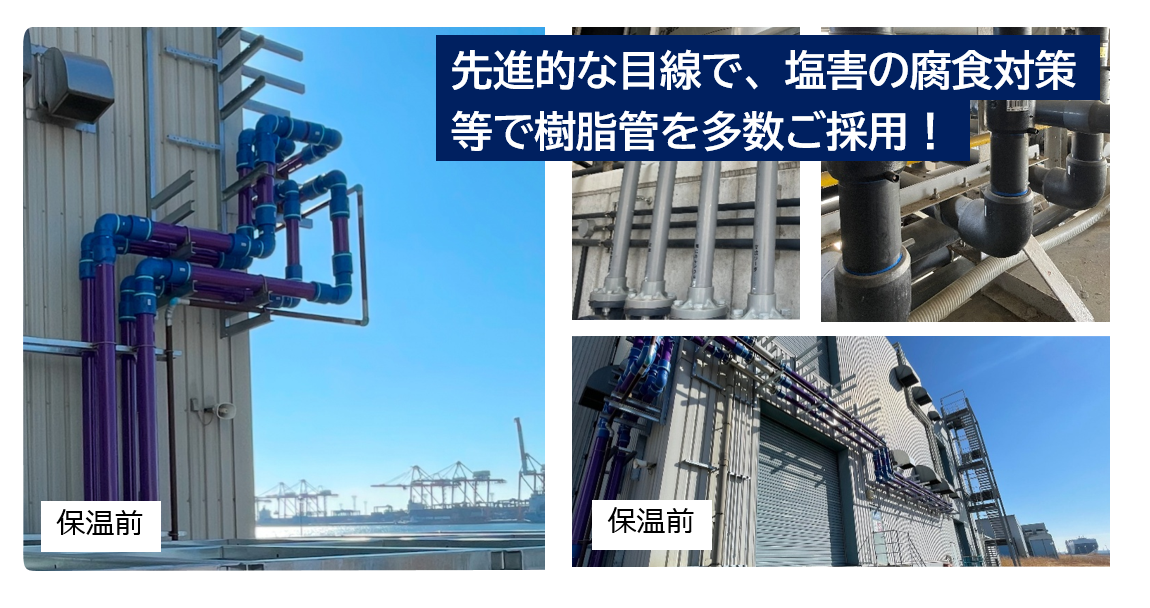 海沿いにある工場施設の空調冷温水配管改修工事で、配管の腐食対策として樹脂管をご採用いただいた事例です。配管選定にあたっては、維持管理のし易さと長寿命化が求められました。