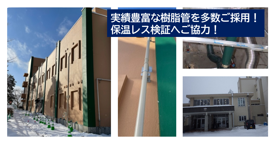 国立大学の改修工事で、軽量で省施工な樹脂管を多数ご採用いただいた事例です。配管選定にあたっては寒冷地の豊富な採用実績が求められました。