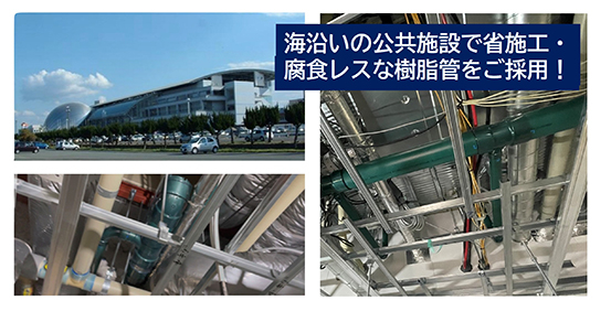 海沿いにある公共施設の給排水配管・空調配管の新築工事で軽量で省施工な樹脂管を多数ご採用いただいた事例です。配管選定にあたっては豊富な採用実績が求められました。