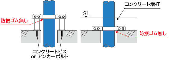 ゴム付きの床バンドを使用すると、管がズレてしまいたわみや応力集中の原因になります。スラブ床面支持の際には、防振ゴム無しの床バンドで確実な支持固定を行ってください。