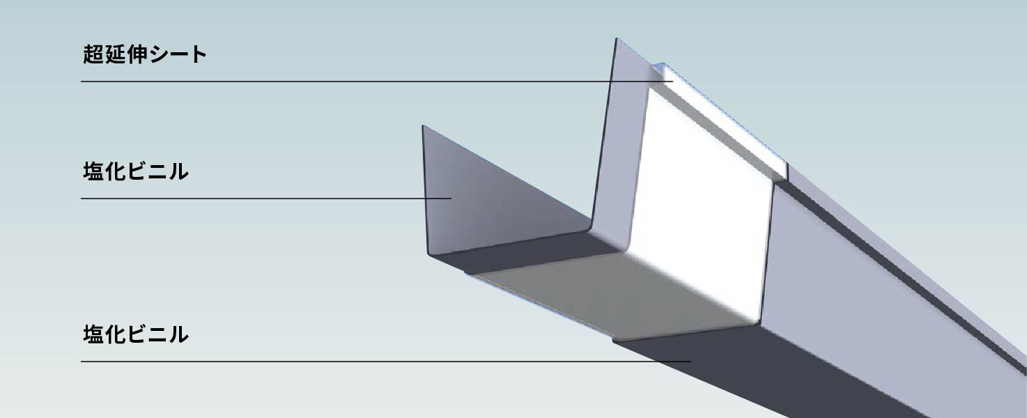 超延伸シートを芯材に、塩ビ樹脂の3層で