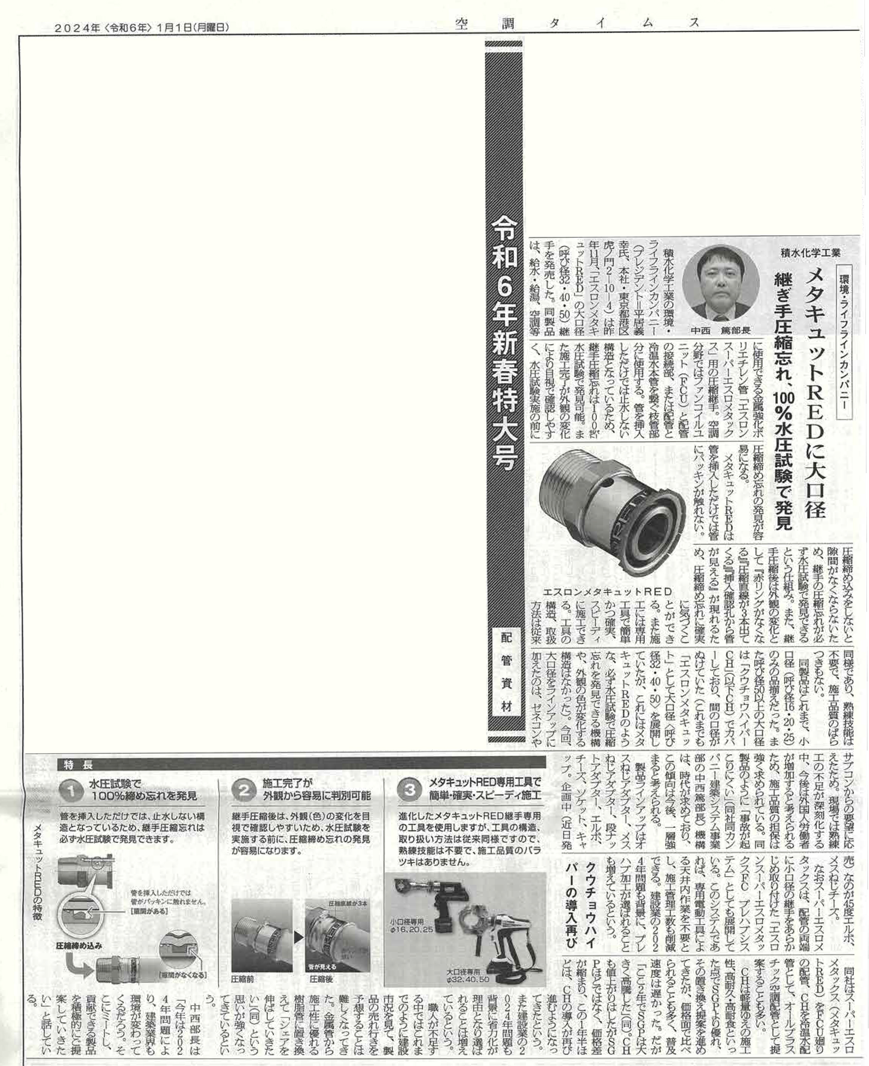 2024年1月1日に発行の空調タイムスの「令和6年新春特大号」にて、継手の圧縮忘れを100%水圧試験で発見できるエスロンメタキュットREDに大口径継手が発売されたことが紹介されました。