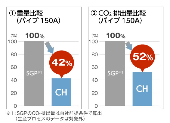 このたび川崎設備工業様の施工により、冷温水用高性能ポリエチレン管を採用された川崎重工業 名古屋第一工場様において、SGP採用時と比較した際の重量削減効果・CO2排出量削減効果を確認いただきました。