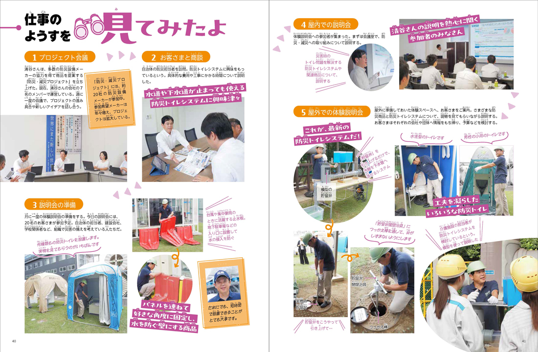 図鑑シリーズ『キャリア教育にいきる+仕事発見!図鑑(5) 防災の仕事』では “防災トイレシステム営業”の仕事として、東日本セキスイ商事の活動が紹介されました。