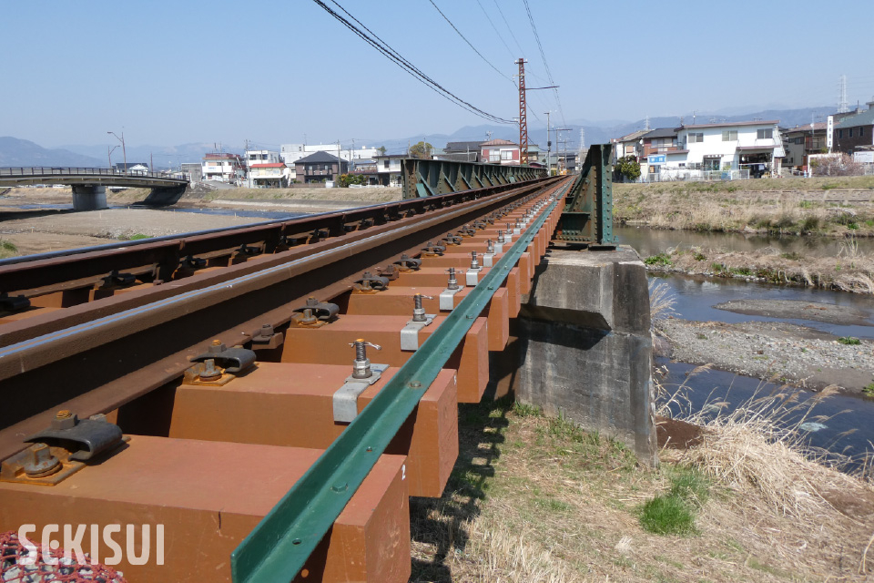 藤井様 : 近年の事例では、駿⾖線の⾕⼾川橋梁で2019年度にFFU合成まくらぎに交換しました。それ以前は1995年から⽊製枕⽊を部分交換しながら24年間使っていました。