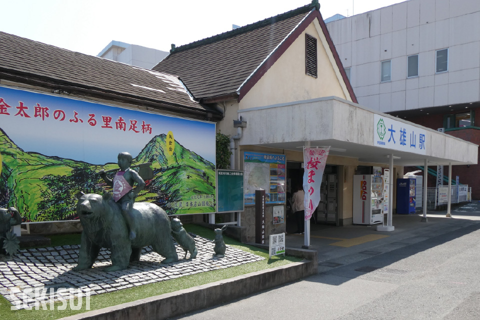 また終着駅であります⼤雄⼭駅には「まさかりかついで ⾦太郎〜♪」でおなじみの⾦太郎と熊の銅像がお出迎え。さらに運がよければ97年前の昭和3年に、⽇本国有鉄道(国鉄)の前⾝である鉄道省にてモハ30166として新製された、コデ165が留置されているのを⾒られるかも。駅舎もかわいく、何度でも乗りに⾏きたくなりますね︕